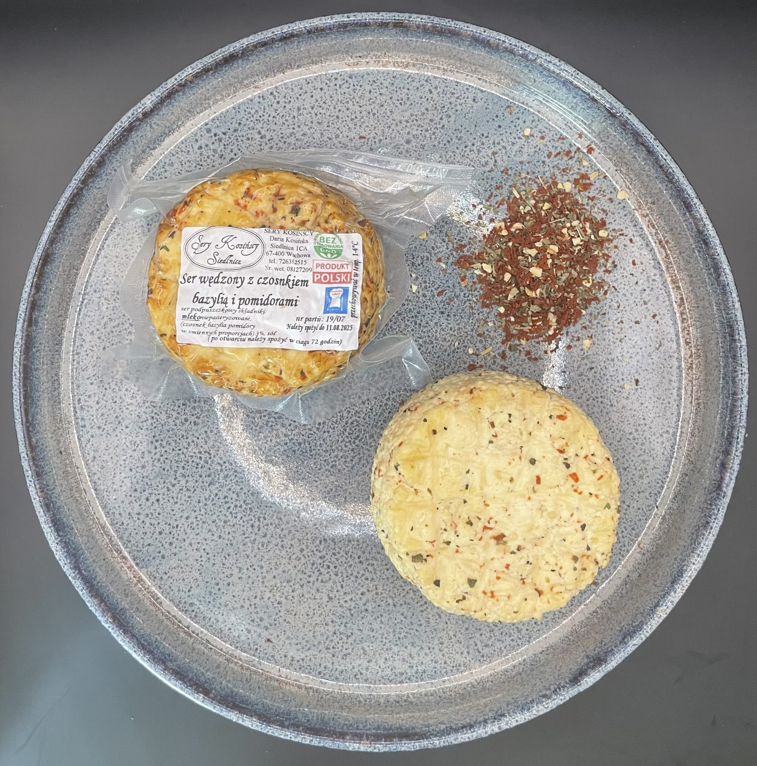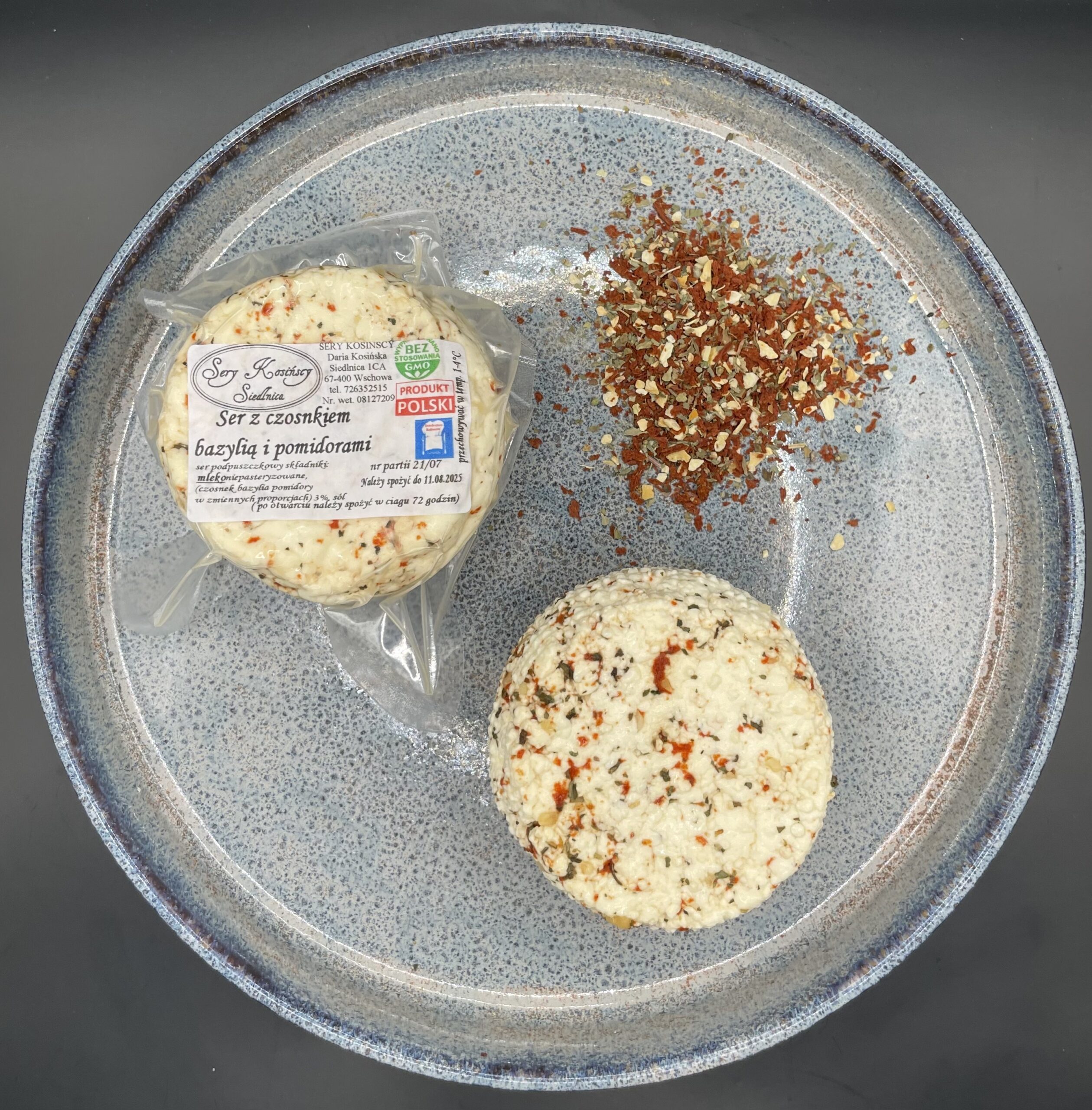 Składniki: mleko niepasteryzowane, sól, czosnek, bazylia, suszone pomidory, podpuszczka mikrobiologiczna.