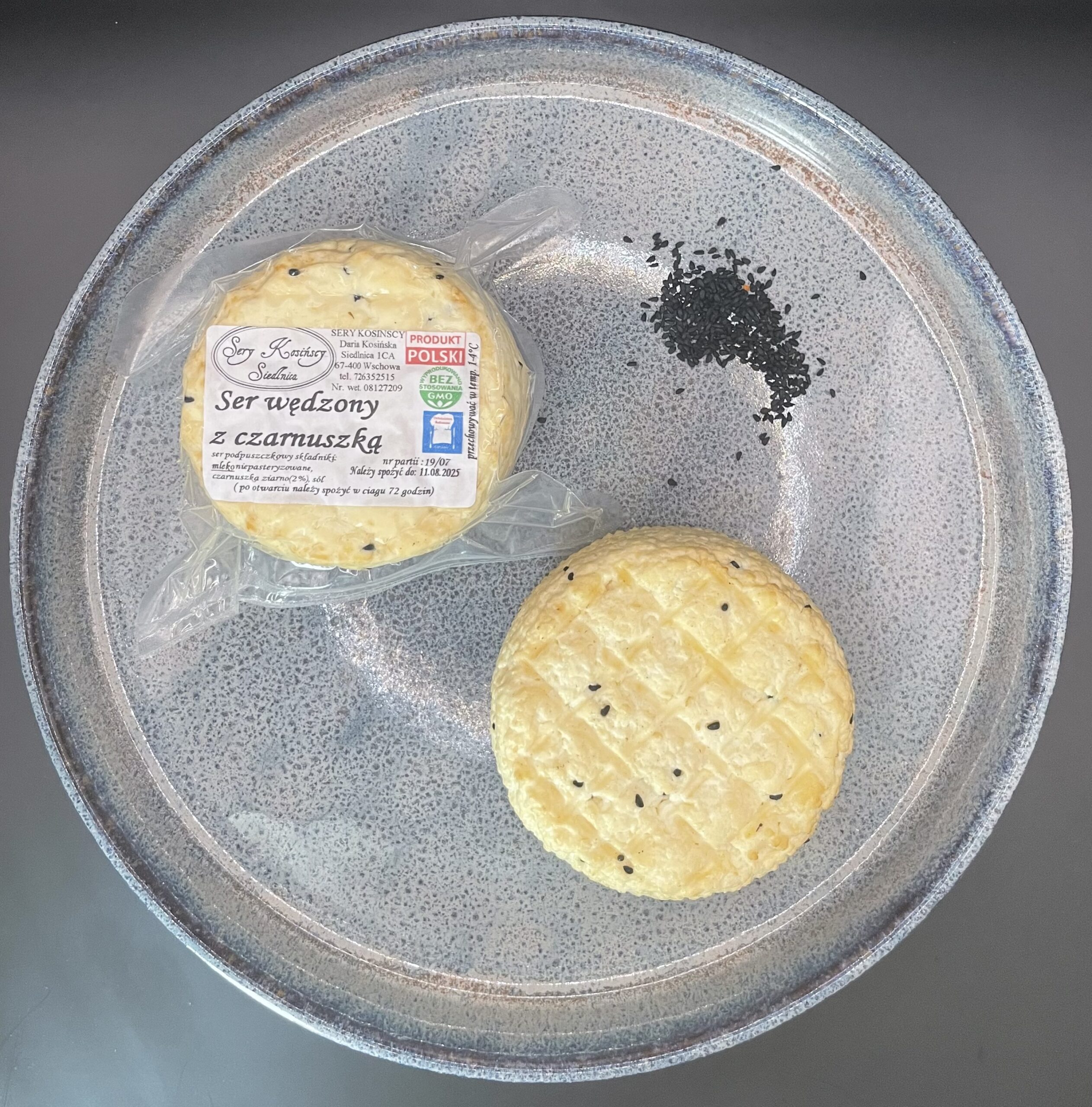 Ser podpuszczkowy, według naszej receptury, z dodatkiem czarnuszki. Wytwarzany z pełnego, niepasteryzowanego mleka. Wyrazisty w smaku, sprężysty w konsystencji, wędzony naturalnie drewnem olchowym.