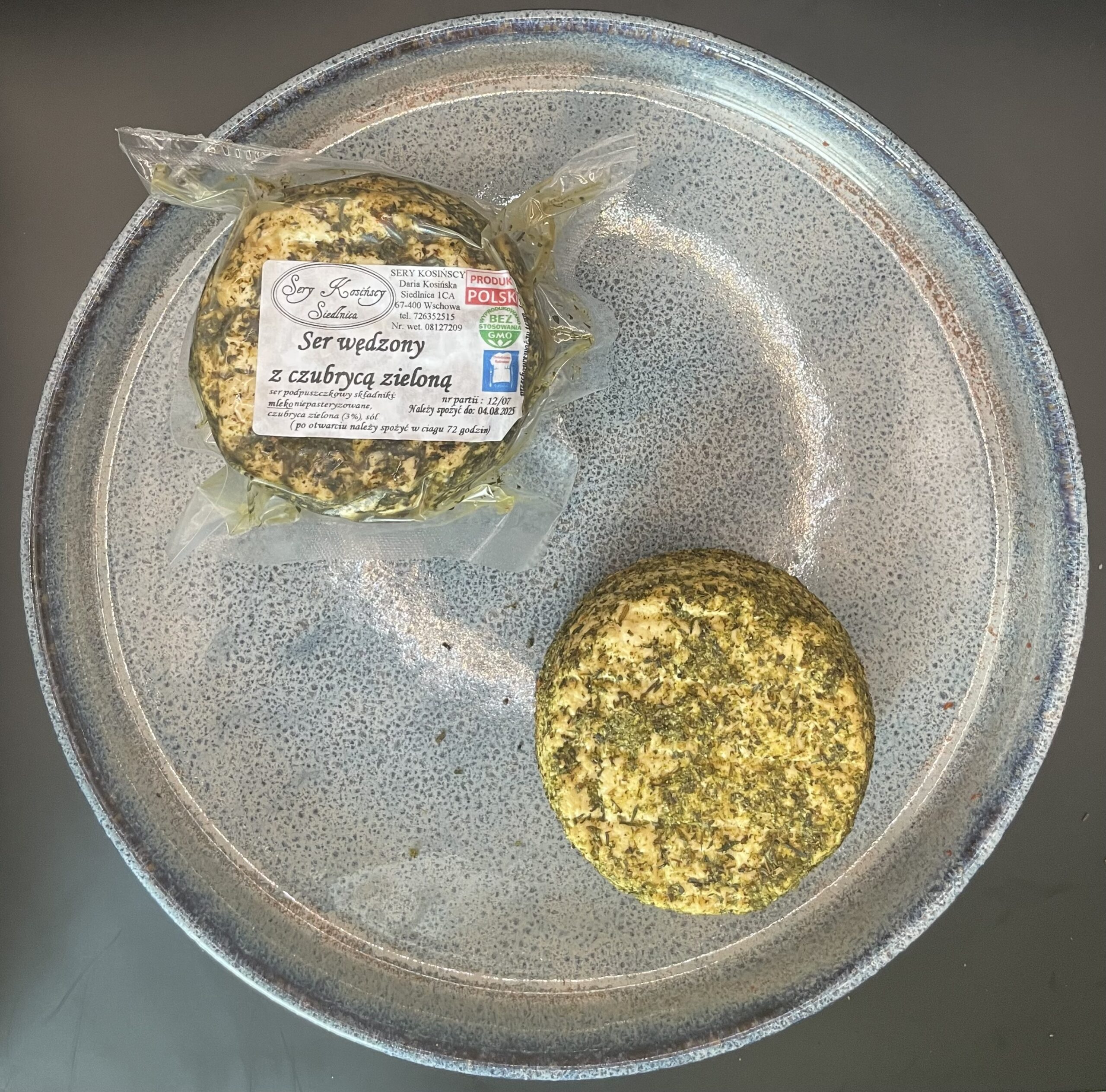 Ser podpuszczkowy, według naszej receptury, obtoczony w przyprawach – czubryca zielona. Wytwarzany z pełnego, niepasteryzowanego mleka. Delikatny w smaku, sprężysty w konsystencji, o aromacie ziół, wędzony naturalnie drewnem olchowym.
