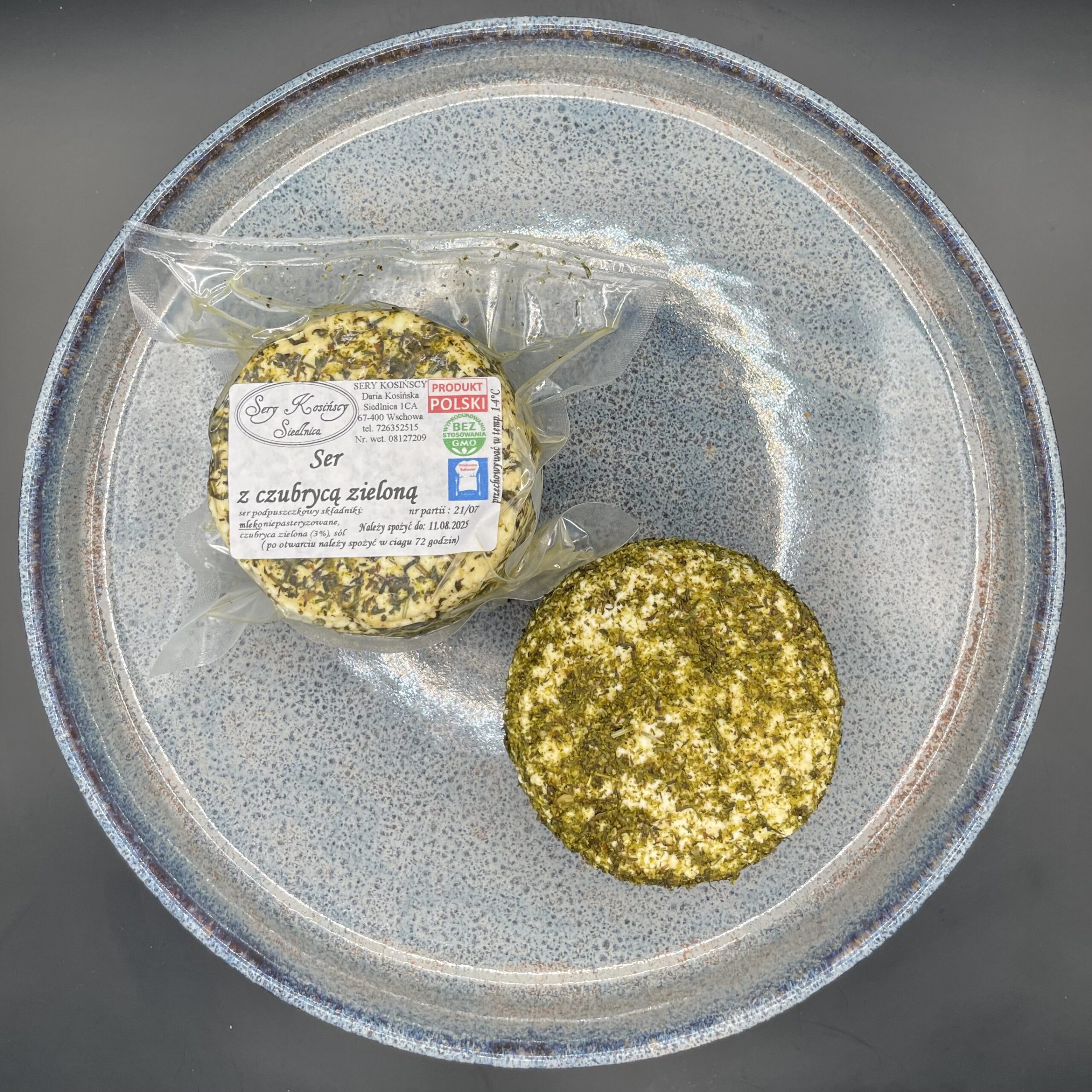 Ser podpuszczkowy, według naszej receptury, obtoczony w przyprawach – czubryca zielona. Wytwarzany z pełnego, niepasteryzowanego mleka. Delikatny w smaku, sprężysty w konsystencji, o aromacie ziół.